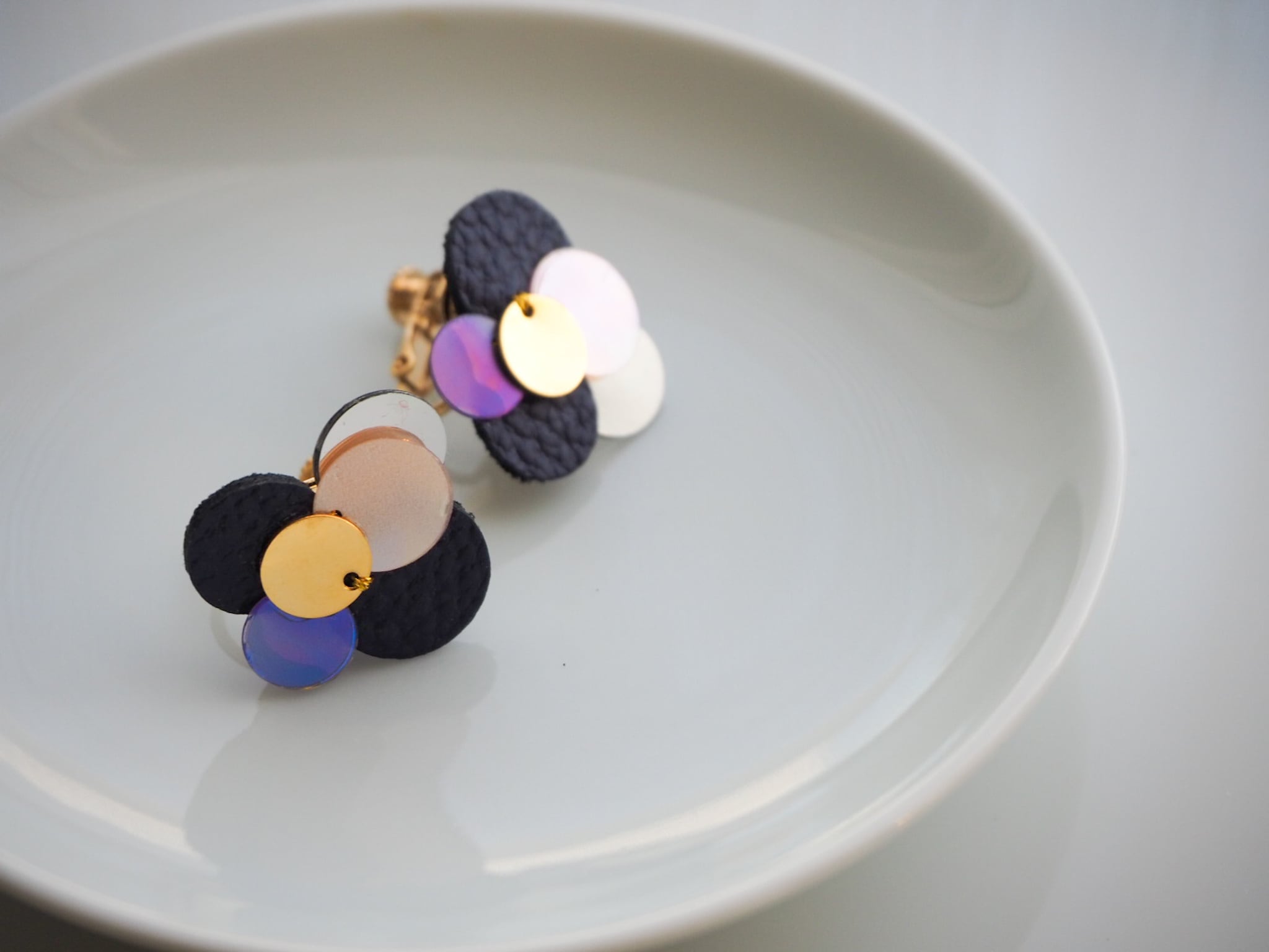 丸、〇の形にこだわって、レザーパーツとスパンコールを重ね合わせました。