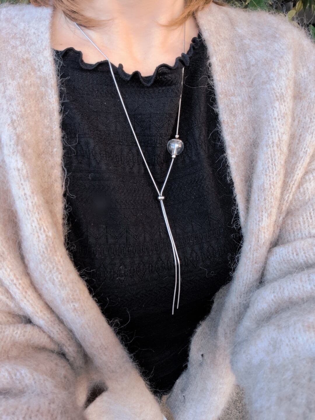 ループタイのデザインで、洋服に合わせ、スライドで長さを調整できます